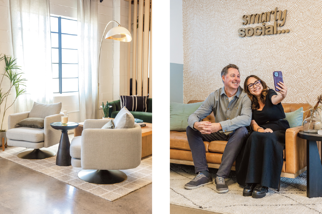 Jami and Kenny moved the Smarty Social office from downtown Santa Ana to Old Towne in 2024, and have about 30 employees. As a marketing agency, they also needed a dedicated production space, as they work with clients like Invisalign and Allergan Aesthetics, creating human stories that help medical devices and health innovations connect with people.