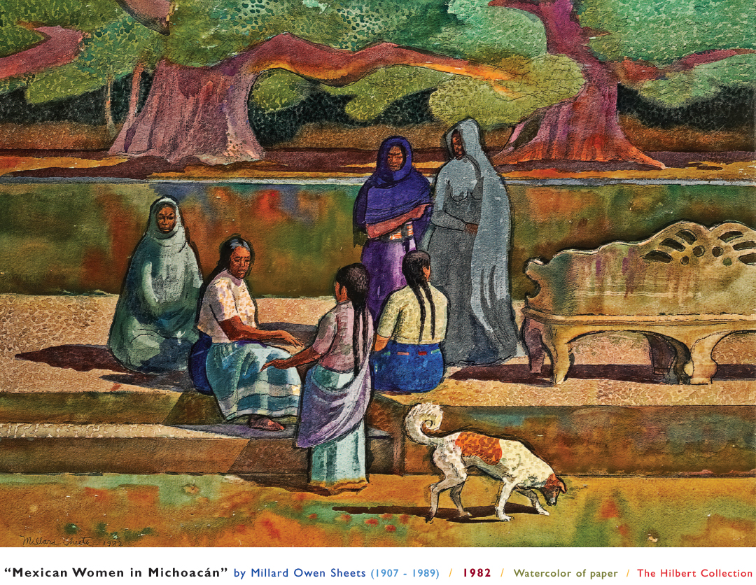Among the most striking pairings is that of Millard Sheets, a central figure in California Scene painting, who is represented by two distinct works. “Fish Rock Island” (1979, Bank of America) captures the drama of the Mendocino coast, while “Mexican Women of Michoacán” (1982, Hilbert Collection; seen on this issue’s inside front cover) conveys quiet dignity and cultural richness. Seen together, they reveal Sheets’s deep empathy for both land and people, united by his glowing palette and compositional precision.