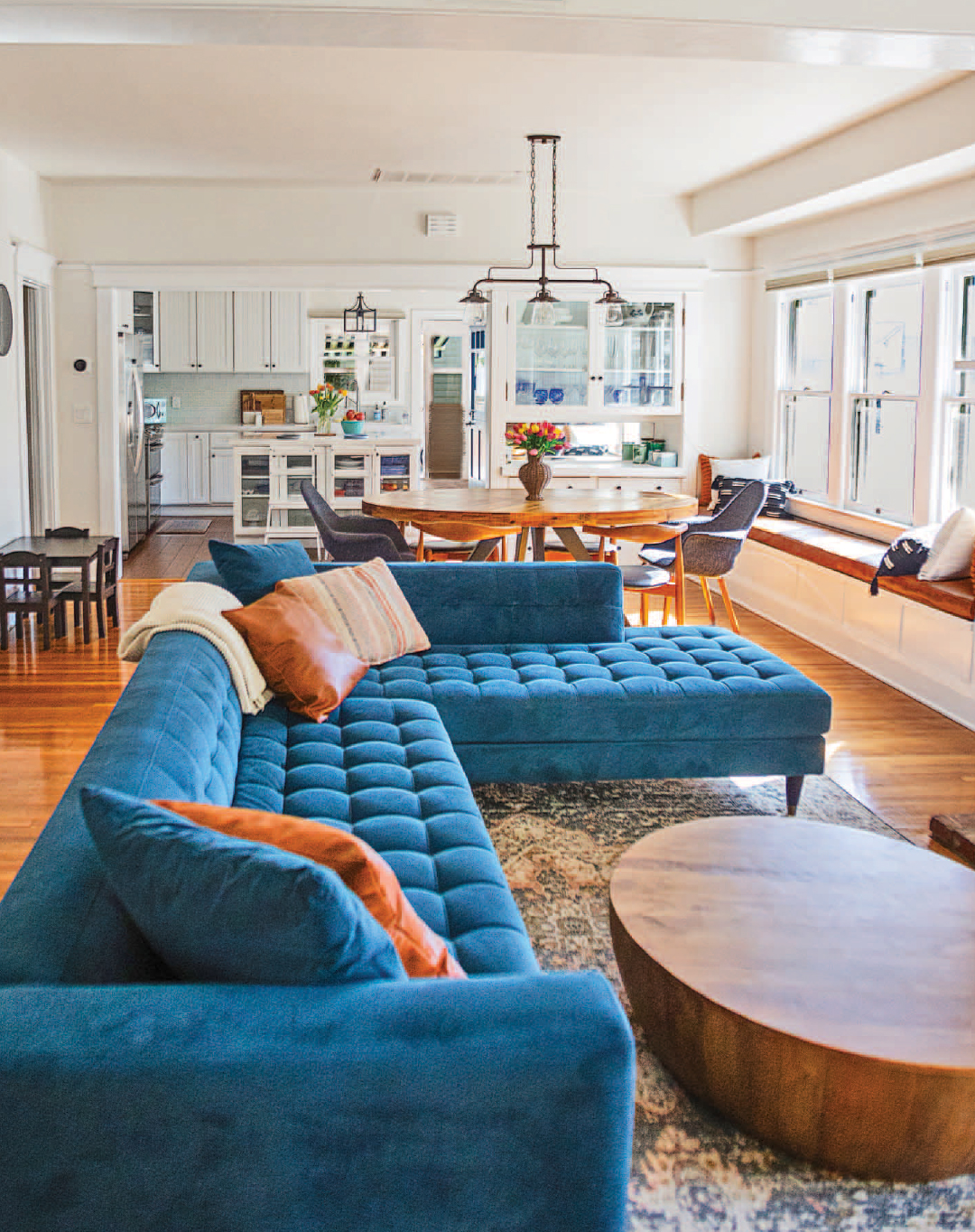 The light and airy main living space includes a built-in window seat original to the home, along with an original built-in china cabinet.