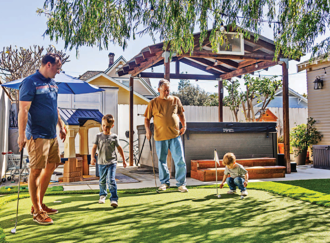 The putting green in the backyard provides one of many fun activities for three generations of Smith boys.