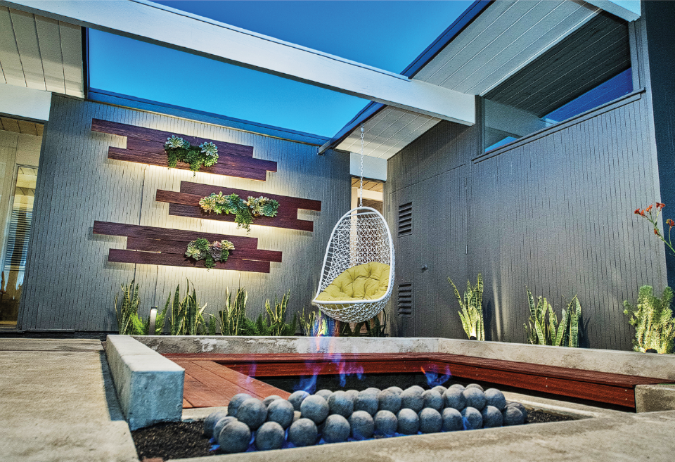 The Clarks worked with their neighbor to design this large atrium featuring a sunken seating area, fire feature, hanging egg chair and a “living” wall, recently completed by Seasiders Concrete.