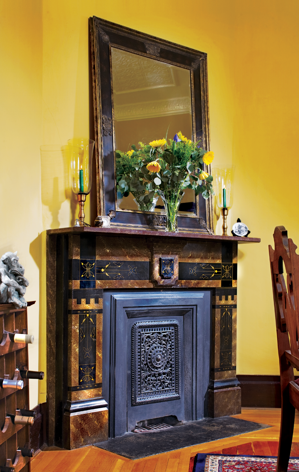 Among the original elements of the house include this stunning fireplace made of rare stone, a clawfoot tub in the bathroom, pickets on the balcony, and mahogany trim and double-hung windows throughout.