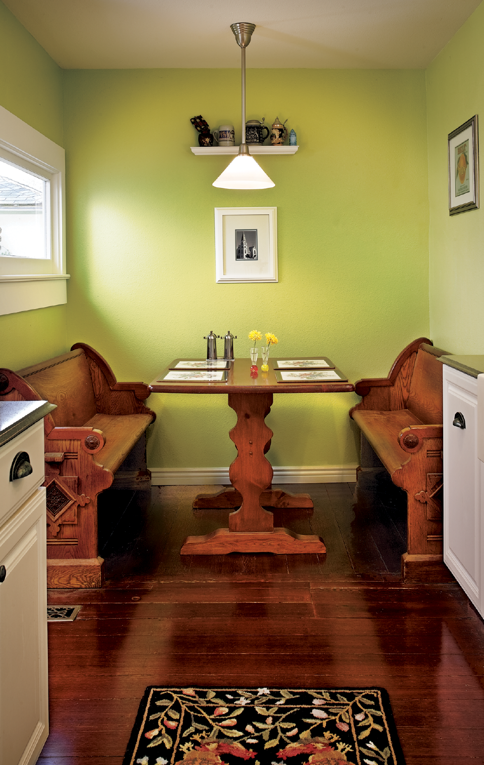 The couple’s kitchen nook contains antique church pews from an old church in Oakland, California, that survived the 1906 earthquake but was damaged in the 1989 quake. Above the table hangs a photograph of the church. The wood flooring is original to the home, salvaged from beneath layers of linoleum.