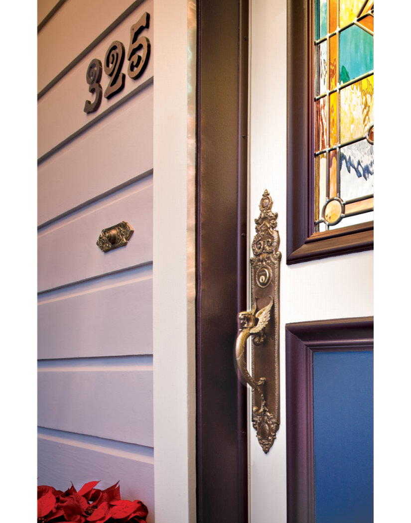 This ornate brass door handle is one of many intricate gothic-style fixtures that Kris and Mike have added to the home. The head of the winged griffin is pressed to open the door. Stained glass was purchased from The Glass Eye in Orange.